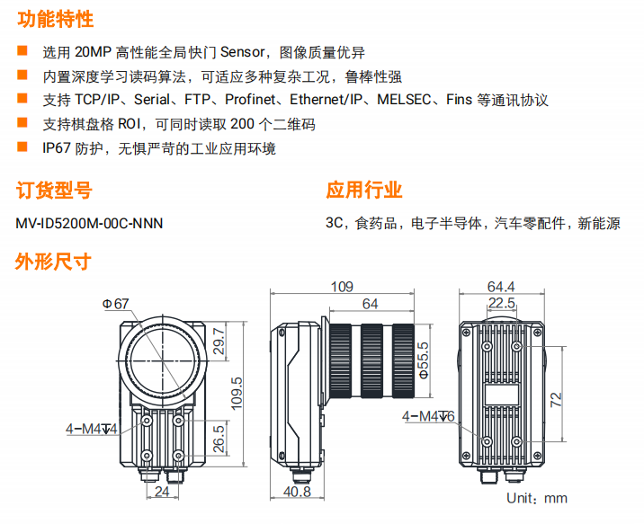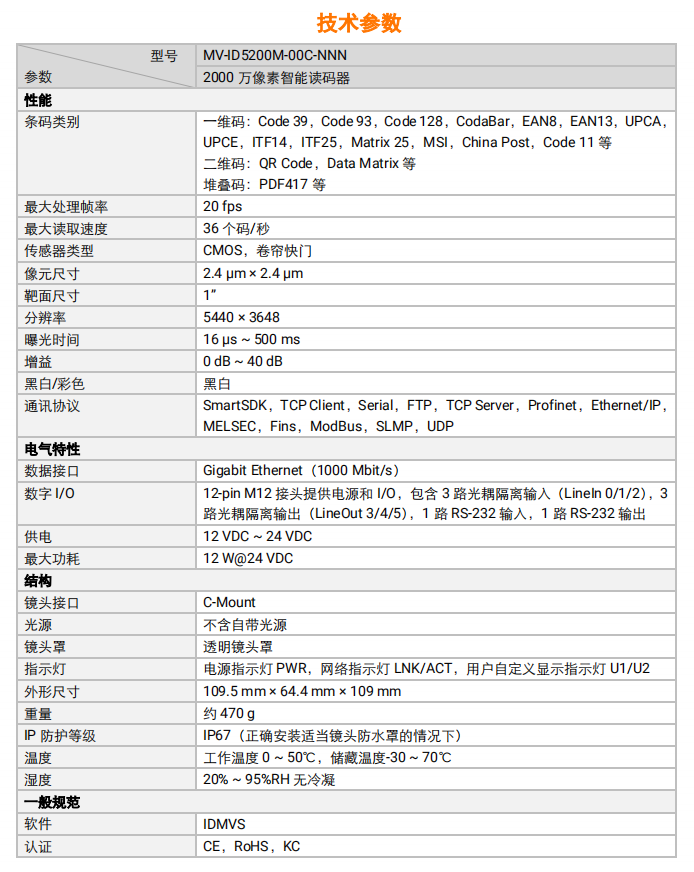MV-ID5200M-00C-NNN 型号智能读码器,可高速读取多种码制的一维码和二维码,读取速度最大可达36个码/秒。采用20MP超大分辨率全局快门Sensor,灵活搭配C口镜头完成超大视野和景深读码。